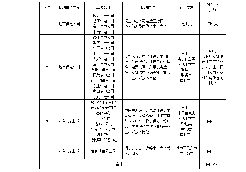 我公司2017年第一批招聘需求人员数量约为400人,最终招聘数量按照上级单位核准情况进行调整。第一批具体招聘单位及专业需求见下表。