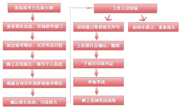 1、提交报考申请。报考人员可在2012年10月15日8:00至24日18:00期间登录考录专题网站,提交报考申请。报考人员只能选择一个部门(单位)中的一个职位进行报名,不得用新、旧两个身份证号同时报名,报名与考试时使用的身份证必须一致。报名时,报考人员要仔细阅读诚信承诺书,提交的报考申请材料应当真实、准确。报考人员提供虚假报考申请材料的,一经查实,即取消报考资格。对伪造、变造有关证件、材料、信息,骗取考试资格的,将按照《公务员录用考试违纪违规行为处理办法(试行) 》的有关规定予以处理。