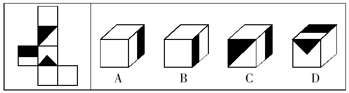 这类题属于空间推理题,平面图形的折叠图和立体图形的展开图常需要考生具备一定的空间想象能力。本题中黑色长方形的阴影边和黑色大直角三角形的阴影边相邻,故排除B项和C项;黑色小直角三角形的阴影边所相邻的面是空白面,故排除D项。A项可由题干图形折成。