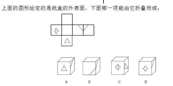 A选项中可以用三角形的面画箭头,右边的面不对排除A,B选项中两条斜线的面用找点看线的方法可排除。D选项中斜线的面只能是最右边的这个,白色的面只能是最上面的这个,可以把最右边的斜线面移到十字面的左边,形状不变。画个时针可排除。故选择C选项。