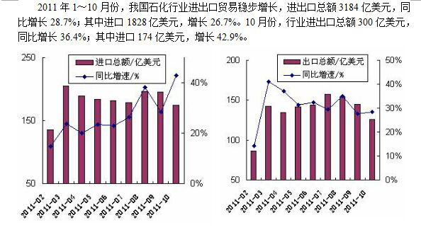 118.【解析】 A。这个题目实际考查的是混合增长率。整体增长率介于部分增长率之间。2011年1~10月份,我国石化行业进出口贸易稳步增长,进出口总额3184亿美元,同比增长28.7%; 10月份,行业进出口总额300亿美元,同比增长36.4%;故所求增长率低于28.7%;因此,本题的正确答案为A选项。