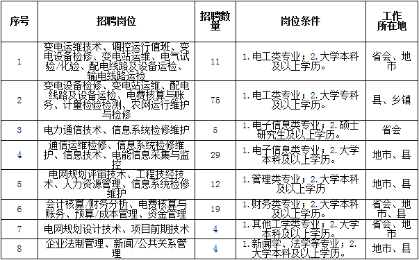 招聘单位包括国网呼伦贝尔供电公司、国网兴安供电公司、国网通辽供电公司、国网赤峰供电公司等四家市供电公司及所属县级供电企业;国网蒙东经研院、国网蒙东电科院、国网蒙东检修公司、国网蒙东信通公司。拟招聘岗位信息见下表: