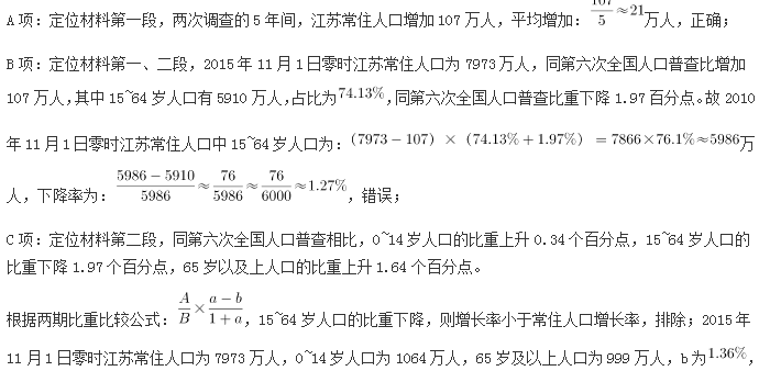 根据题干求增长结合选项给出单位万人可知,判定此题为增长量计算问题。定位材料第一段,2015年11月1日零时江苏常住人口为7973万人,比第六次全国人口普查增加107万人;定位材料第二段,2015年11月1日的调查中,65岁及以上人口人数为999万人,所占比重为,同第六次全国人口普查比,比重上升1.64个百分点,则调查5年间,65岁及以上人口增加:万人,A.项最接近。