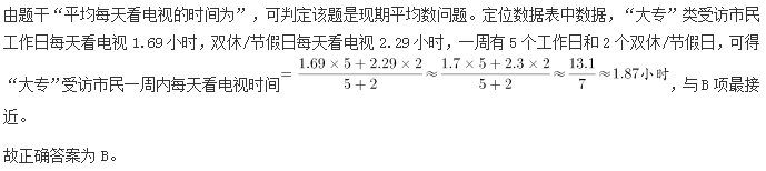 D项:观察表中数据第三行,“高中/中专”类双休/节假日看电视花费时间为2.86小时,上网花费时间为2.75小时,所以“高中/中专”类双休/节假日上网花费时间少于看电视,错误。