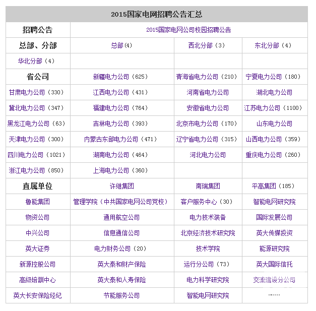 2015国家电网各公司校园招聘公告已经发布,此次招聘采取网上报名的方式,目前大部分公司正处于报名阶段,各省公司和直属单位招聘的批次和报名的截止时间各不相同。