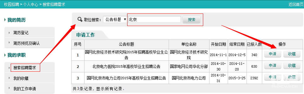 五、申请工作在“我的求职”中搜索招聘需求,可以输入关键词进行搜索,找到要申请的公司后点击后面的申请工作后选择职位即可。如果未定申请公司可先把心仪的进行收藏,之后再“我的收藏”里查看公告详情,考虑之后再申请。
