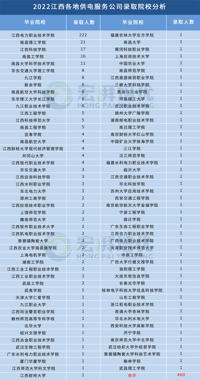 2022年江西各地供电服务公司计划招聘460人,其中:面向国内普通高校全日制应届毕业生(2022年毕业)招聘410人,面向2020年和2021年毕业的国内普通高校全日制毕业生招聘50人。录用人员直接与各县、市(区)供电服务有限公司签订劳动合同,均安排至县城以外的乡镇供电服务一线岗位工作。