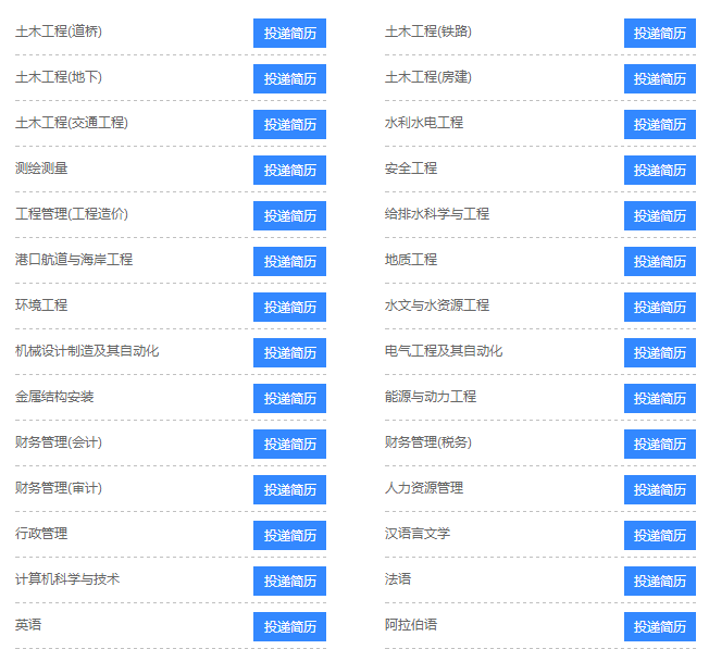 土木工程(道桥、铁路、地下、房建、交通工程等)、水利水电工程、测绘测量、安全工程、工程管理(工程造价)、给排水科学与工程、港口航道与海岸工程、地质工程、环境工程、水文与水资源工程、机械设计制造及其自动化、电气工程及其自动化、金属结构安装、能源与动力工程、财务管理(会计、税务、审计)、人力资源管理、行政管理、汉语言文学、计算机科学与技术、法语、英语、阿拉伯语等专业。