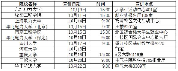 本批校园招聘将于10月9日开始组织开展,具体行程如下,如有变更,在相关院校网站更新。符合招聘条件的其他院校毕业生,可就近选择参加。