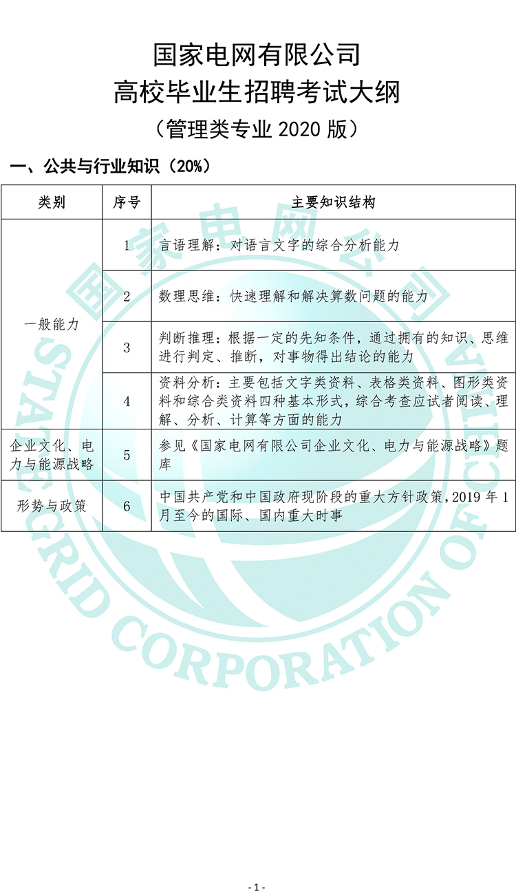2020国家电网公司高校毕业生招聘考试大纲(管理类专业2020版)